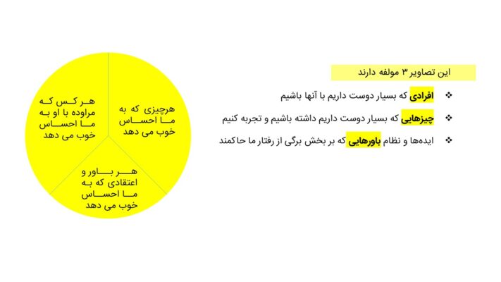 و مولفه ی سوم عقاید ما هستند. باورهایی که فکر میکنیم اگر در زندگی بر اساس آنها زندگی کنیم احساس خوبی خواهیم داشت. این باور ها می توانند باور های مذهبی یا ارزش های اخلاقی باشند..